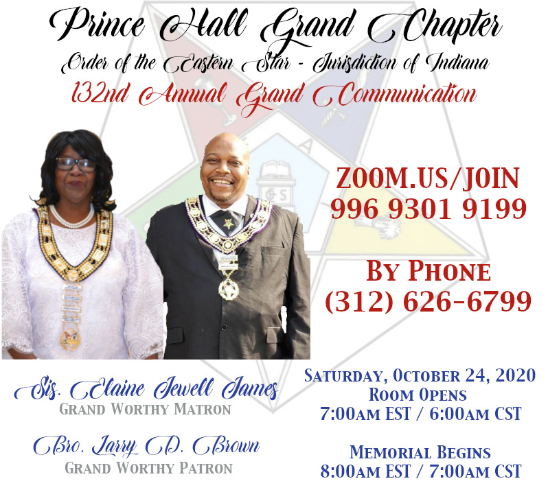 Prince Hall Grand Chapter was blessed to conduct our 132nd Annual Grand Communication virtually on Saturday, October 24, 2020 under the leadership of Grand Worthy Matron, Elaine Jewell James and Grand Worthy Patron, Larry D. Brown.