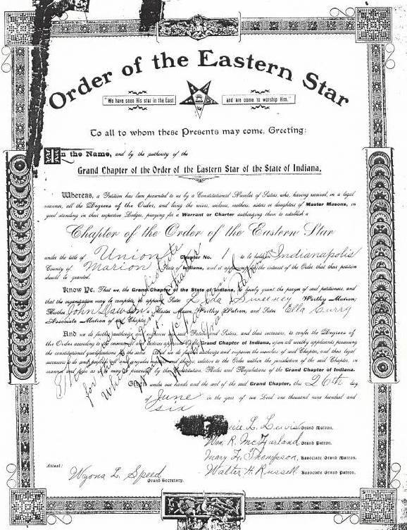 In 1892, the name “Court” was dropped, and the word “Chapter” was taken by the Order. All Courts of the Order of Eastern Star were ordered to turn in their old charters of which new ones would be issued with the new title of Chapter and charter date of 1888. Though Union Court #1 complied other Courts did not. The Charter date was later destroyed and a new Charter was issued June 26th, 1906 by Jennie L. Lewis, Grand Matron, William R. McFarland, Grand Patron and Wynona L. Speed, Grand Secretary.
