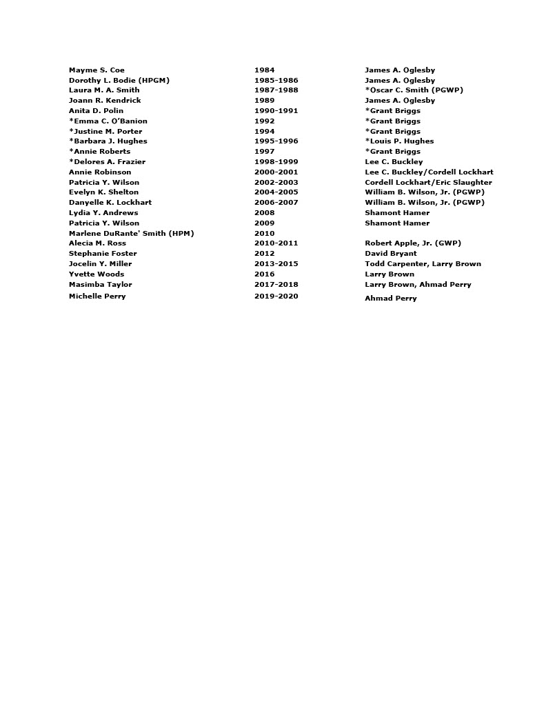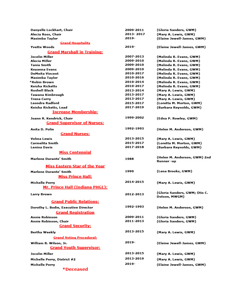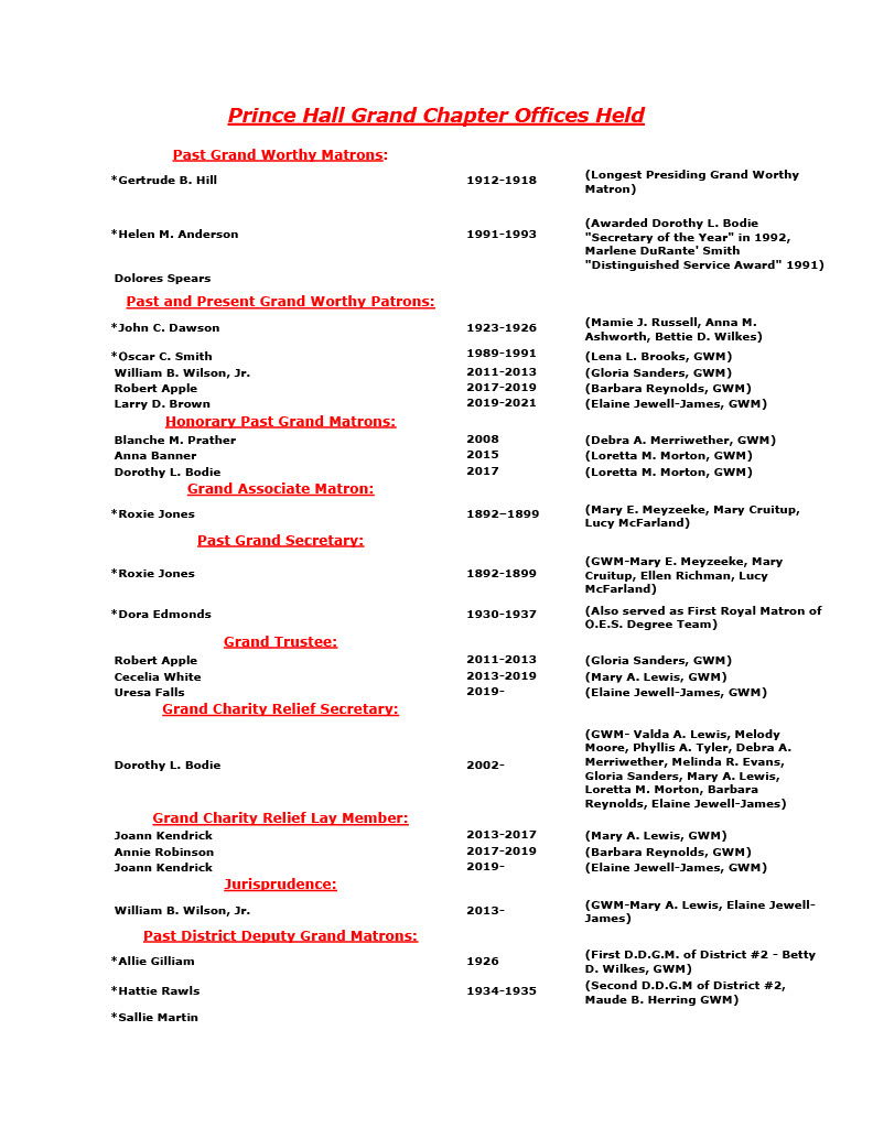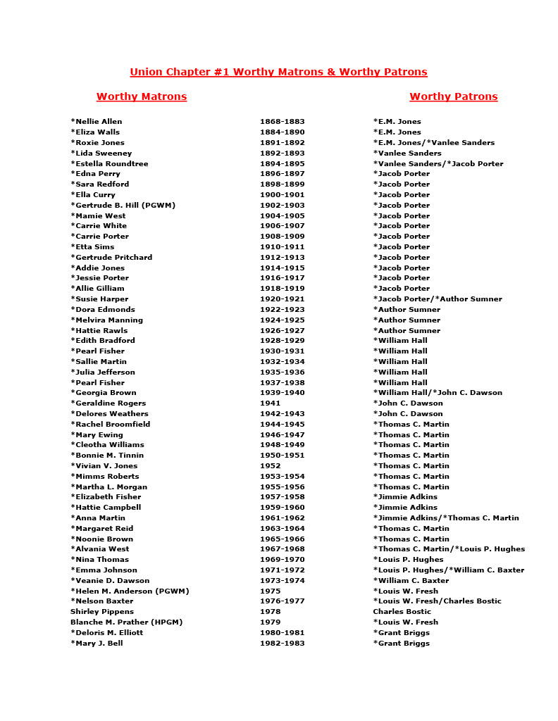Brother E.M. Jones worked with the court with the help of Royal Matron Sister Nellie Allen. They worked in both degrees, the Queen of the South and the Cross and Crown Degrees. “We were permitted by divine providence to carry on the work of the Order of the Eastern Star: this historical development of the Order of the Eastern Star in the State that status established by our predecessors who inaugurated our first Grand Chapter.” Brother E.M. Jones died July 11, 1892. Brother Vanlee Sanders, Past Patron of Union Chapter was the first Grand Chaplin; he was the Past Patron of Union Chapter and a member of Central Lodge #1. Sister Roxie Jones, a member of Union Chapter, was elected Grand Secretary of Grand Chapter, and served from 1892 – 1899. Our Past Grand Worthy Matrons were: Sister Gertrude B. Hill, From Union Chapter #1 served as Grand Worthy Matron from 1012-1918; Sister Helen M. Anderson 1991 – 1993. Our Past Grand Worthy Patrons were Brother Oscar C. Smith of Union Chapter #1 and Central Lodge #1 served as Grand Worthy Patron from 1985 -1986; Brother William B. Wilson of Union Chapter #1 and Central Lodge #1 was elected Grand Worthy Patron from 2011-2013, Brother Robert Apple, of Union Chapter # 1 and C. R. Richardson Lodge #69, was elected in 2017 and Brother Larry D. Brown, of Union Chapter # 1 and C. R. Richardson Lodge #69, was elected in 2019 and currently serves Grand Worthy Patron.